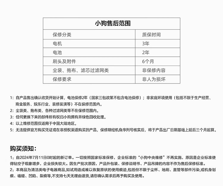 二、退换货政策 自商品签收之日起,7天内无理由退换货。 三、规则及运费说明 1、无理由退换货,请务必在商品签收7日内办理,超过时限将不予办理,退换货邮费需买家自行承担。 (注:退换货之前,请您保证商品的完好无损。损坏、缺件,将无法为您进行退换货办理。) 2、商品签收后如发现缺件、质量有问题,马上联系客服发起退换货,商品质量问题引起的退换货,邮费由卖家承担。 (注:签收后7内发起退换货,超过时限将不予办理) 温馨提示:签收后请您第一时间核对配件,试用机器。 退换货地址:邢台市小狗吸尘器仓库(详情请联系客服:4006-111-456 服务时间:9:00至20:00 周一至周日) |